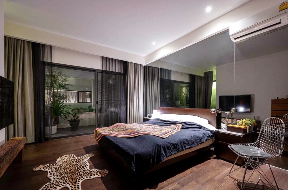 Phòng ngủ chính được trang trí với gam tối màu nhưng vô cùng lôi cuốn.