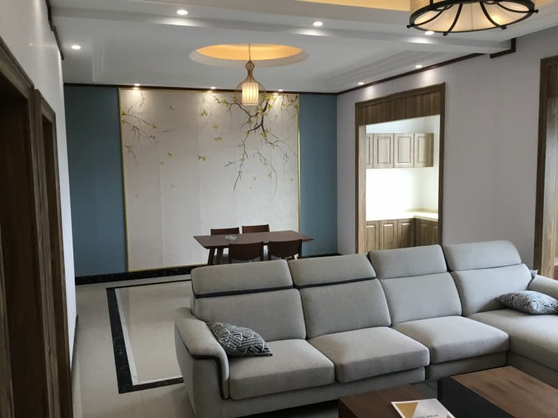 Phòng khách được thiết kế trước cửa kính lớn, khi mở ra có thể kết nối được không gian trong - ngoài.