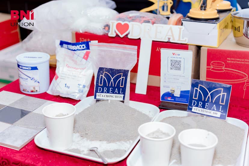 Không chỉ dừng lại ở sp thương mại, Công ty DReal còn tự hào giới thiệu những sản phẩm sản xuất độc đáo. Trong buổi trình bày, ông Dương đã nêu rõ về vữa xây tô và vữa chống thấm trộn sẵn - hai sản phẩm chất lượng cao và tiện lợi trong công việc xây dựng và hoàn thiện.